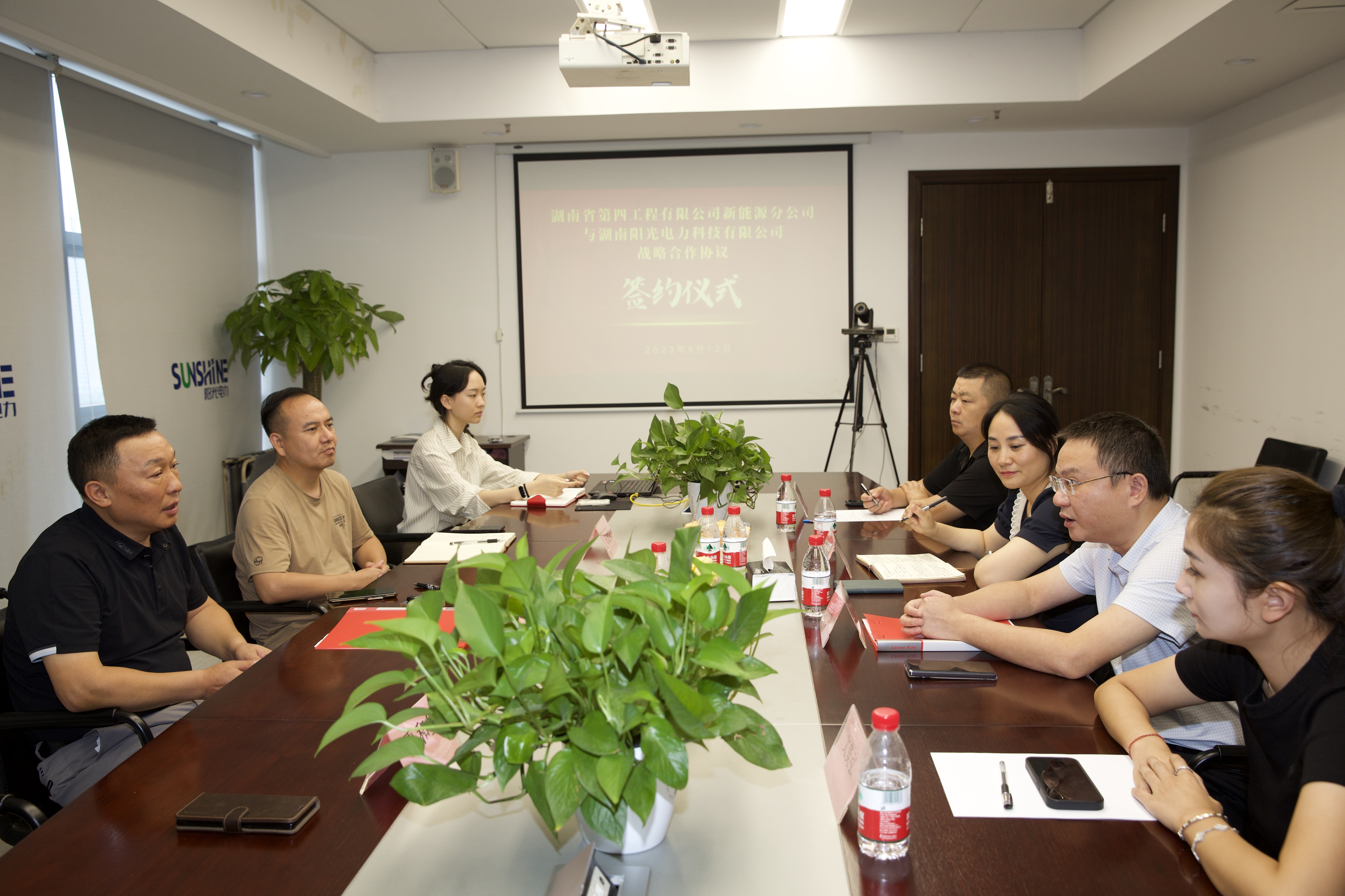 9月12日上午,湖南陽光電力科技有限公司與湖南建投四建集團新能源分公司簽訂戰略合作協議。陽光電力董事長馬勇、新能源分公司支部副書記、經理肖璐,分別代表雙方簽訂戰略合作協議。